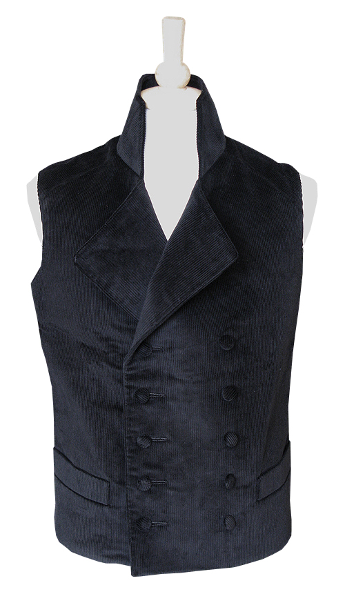 This waistcoat is cut to be a little fuller in the chest and smaller in the armhole than a modern waistcoat. It is also longer than a modern waistcoat, extending down past the waist and ending at the hip. For sizing information.