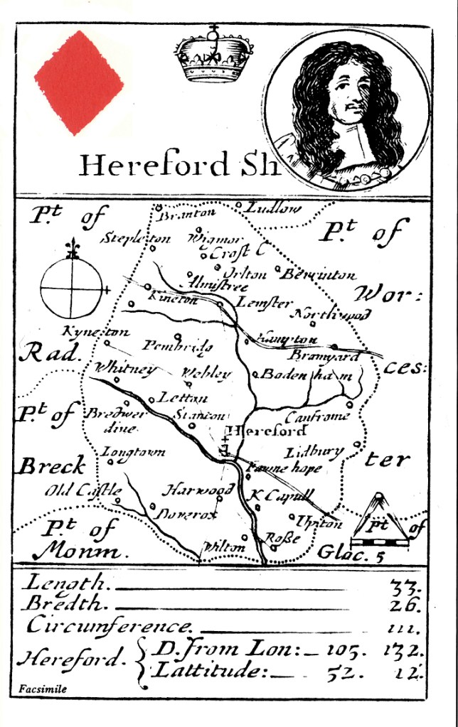 Each card represents a County, as described in the Preliminary Card, headed “The Explanation of These Cards”. The King depicted on the cards is Charles II and the Queen is his wife, Catherine of Braganza.
