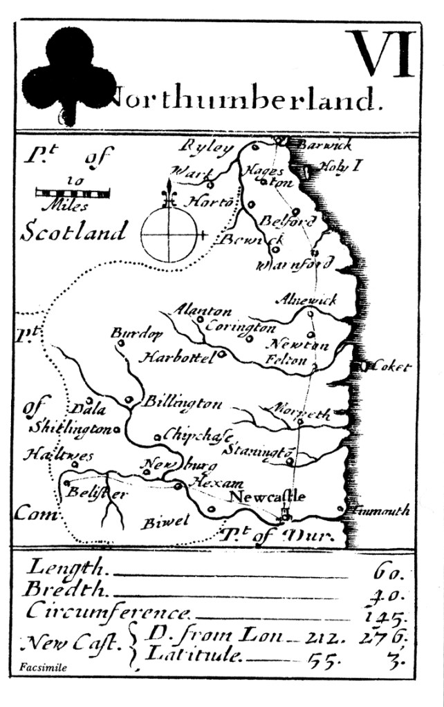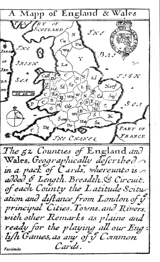“The 52 Countries (sic) of England and Wales, described in a Pack of Cards … Sold by Robert Morden at the Atlas in Cornhill, Will. Berry at the Globe in the Strand, Robert Green in Budge Row, and George Minikin at the King’s Head in S. Martin’s.”