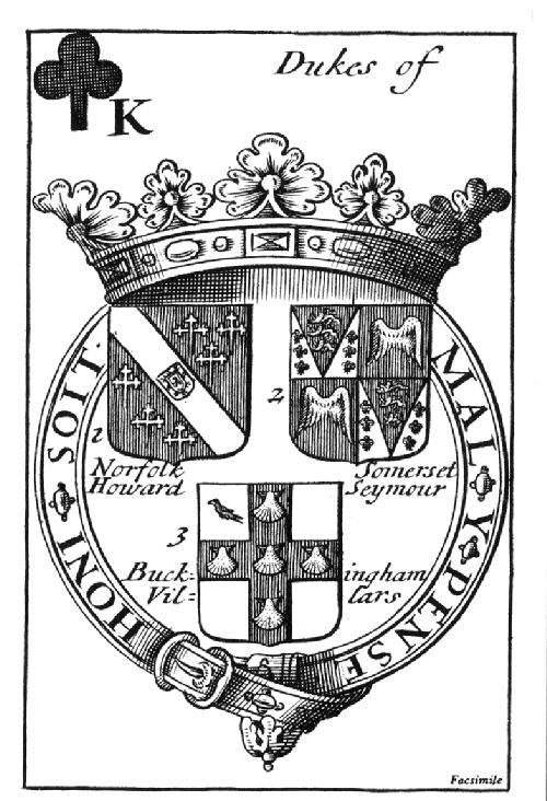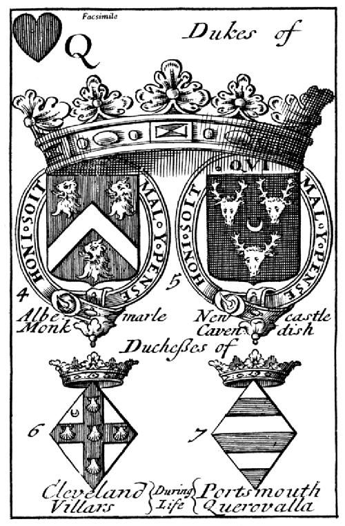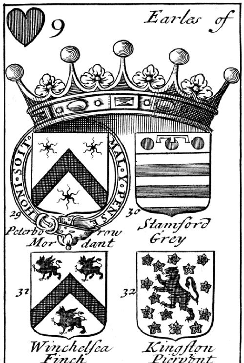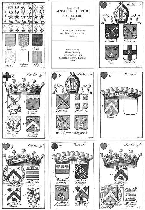 The English edition of Brianville may well have inspired the makers of the present pack to produce a domestic, rather than an international set of cards illustrating the arms of the peers of the United Kingdom. Although the cards are very rare, they must have achieved popularity as they are known in three different editions. The edition reproduced here was the third and published in 1688. Quite logically, the arrangement of the arms of the peers is made according to rank in each suit, the higher the rank, the higher the card value: archbishops and dukes are clearly superior to earls and barons, the arms of the latter being depicted on the lowest cards in all suits. The pack of cards reproduced here is from the Print Collection in Guildhall Library, London.