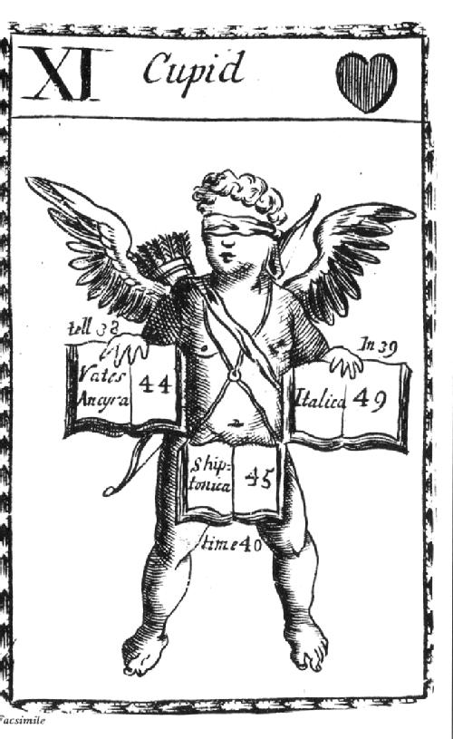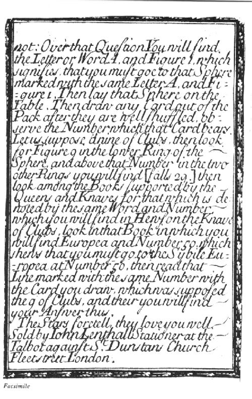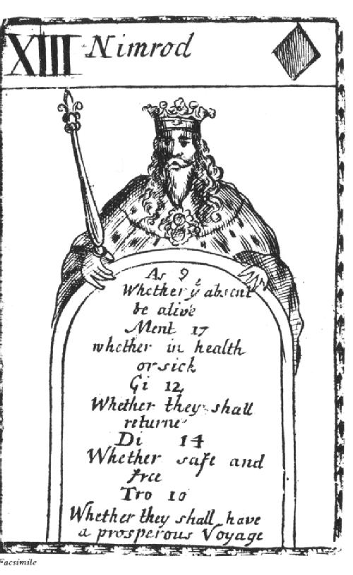 These fascinating cards were first published in 1714. In addition to the usual suit and number markings, they bear figures and diagrams which can be used for fortune telling. A contemporary set of instructions for use is printed on two of the cards. (She’ll meet a tall dark stranger who’s accomplished at whist? You don’t say.)