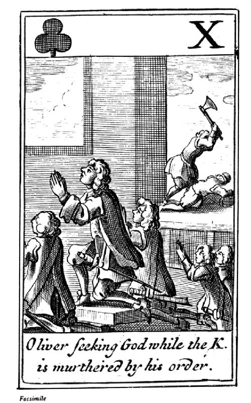 In 1660 Charles II became king of England, after years of austerity under a Commonwealth government which had condemned unproductive forms of enjoyment, such as playing at cards. But it was not until 1679 that a pictorial pack of playing cards was published which satirised the personalities and events of Commonwealth rule. This is a facsimile of that pack.
