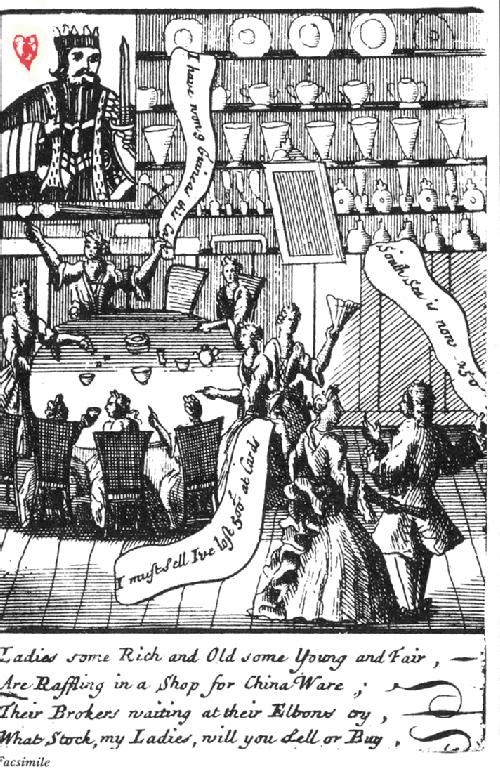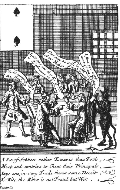 Financial scandals and faulty projects were epitomised by the bursting of the South Sea Bubble, as commemorated in this deck of cards. (An advertisement appearing in Mist’s Weekly Journal in December 1720 for “Bubble cards … tricks of Stock Jobbers … Humours of Change Alley” probably refers to the pack these cards are modelled after.)